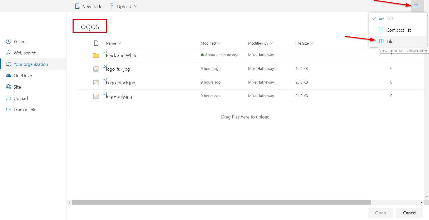 When using organization assets, the user may be faced with a standard list view. Ensure that you provide training for them to switch the view to Tiles view so they can preview the images.